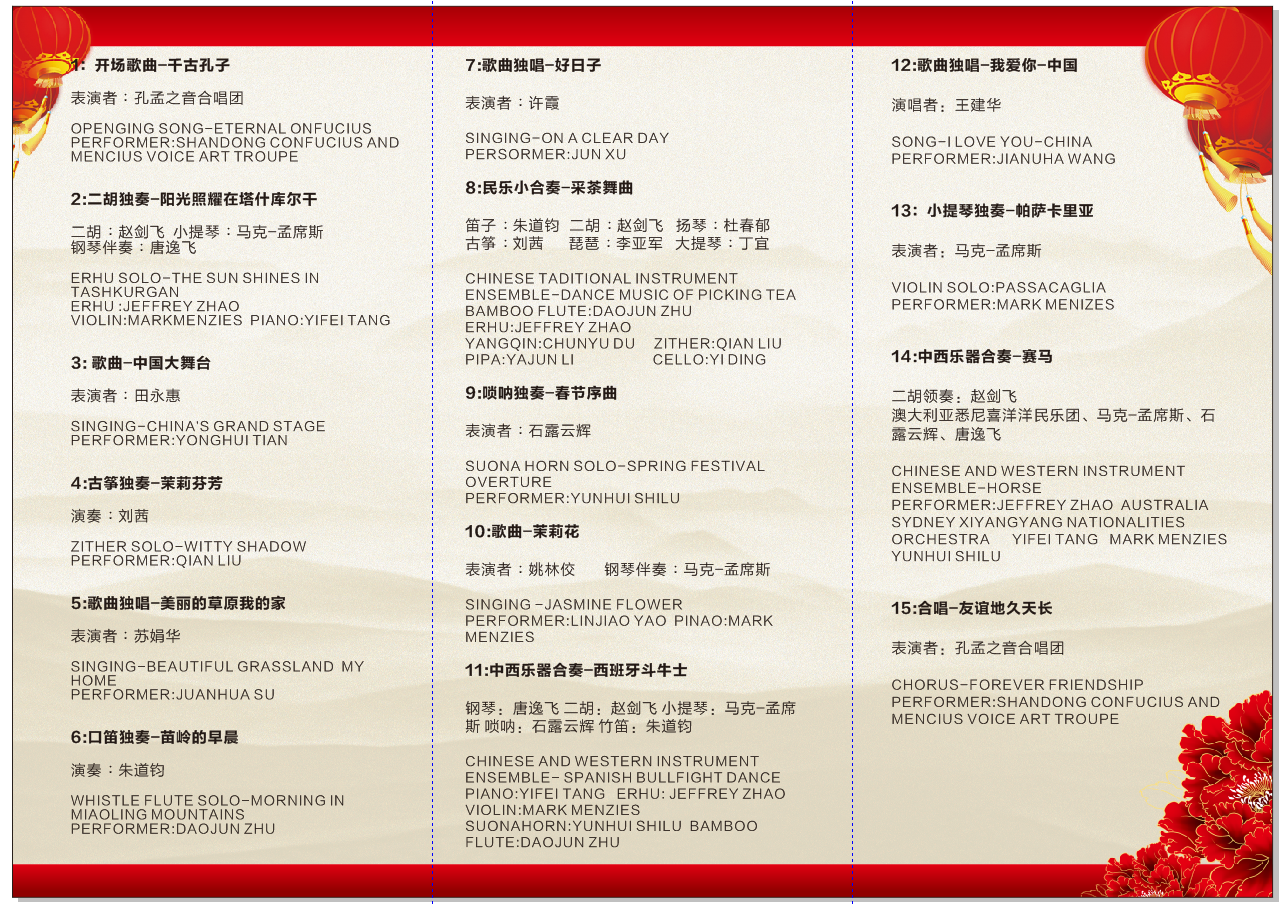 The chosen stage performing groups include: Xi Yang Yang Orchestra, Australian Soong Ching Ling Foundation Arts Group, Jiang Su Zong Hui Xing Meng Yi Shu Tuan, Australian Chu Yuan Rhythm Group, Greater Sydney Dance Group , Xiao-Hong Mao Hao Xin Qing Artist Group ,Beijing(Sydney) Association Art Group, Meadowbank Dance Group, Sydney Fork Art Group, Eastwood Tai Chi Corporation and Rou Li Ball Association.